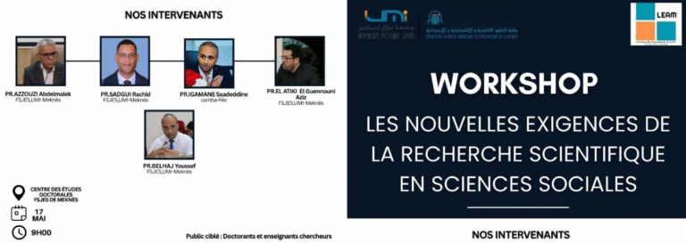 Le Lab d’économie appliquée de Meknès organise, le samedi 17 Mai 2025 à 9h à la FSJES de Meknès, un workshop sur les nouvelles exigences de la recherche scientifique en sciences sociales